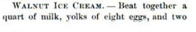 This ice cream recipe comes from Ingall’s Volume 4 (1891) in an entire section about Halloween. Both walnut and chocolate ice cream were on the menu, though the magazine only had the recipe for walnut. For practical reasons I cut the measurements in half, but you are welcome to adjust according to your needs.