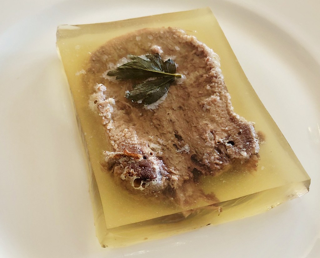 Another possibility is that it was served a bit like “head cheese.” The tongue may have been cut up or even shredded and placed in a pan. The aspic would have been poured over it, sliced and served like cold gelatinous meatloaf. But the fact that this recipe is called Braised Tongue with Aspic and there are no directions to shred or even cut the meat makes me doubt it was served this way.