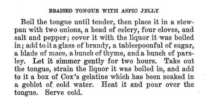 Take out the tongue, strain the liquor it was boiled in, and add to it a box of Cox’s gelatine which has been soaked in a goblet of cold water. Heat it and pour it over the tongue.