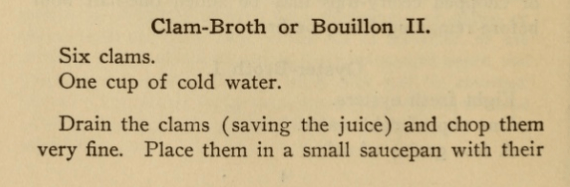 This one comes from a 1905 book called “How to Cook for the Sick and Convalescent” by Helena Sachse. There are two variations, the first calling for clams in their shells and the other using shelled clams that may or may not have come in a can.