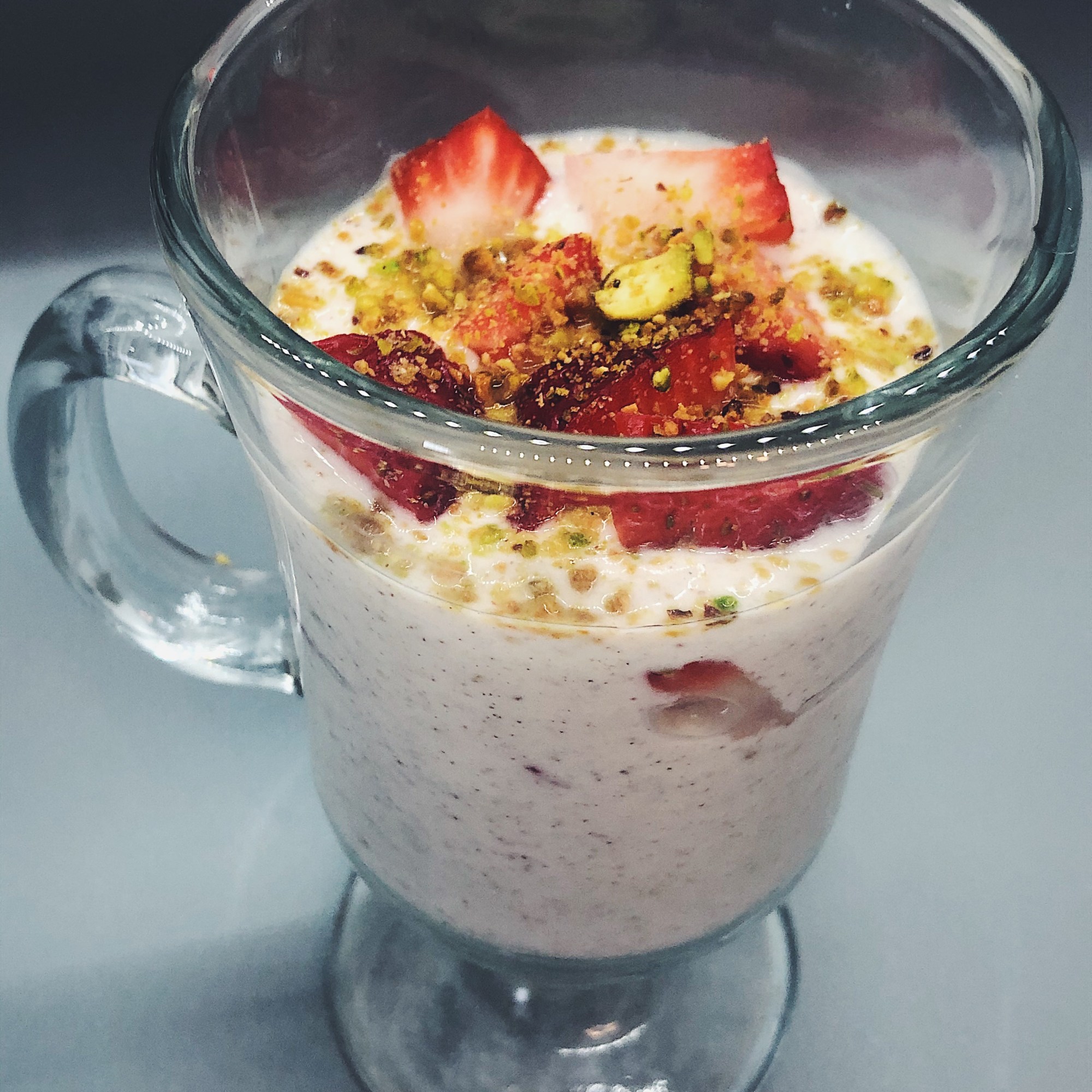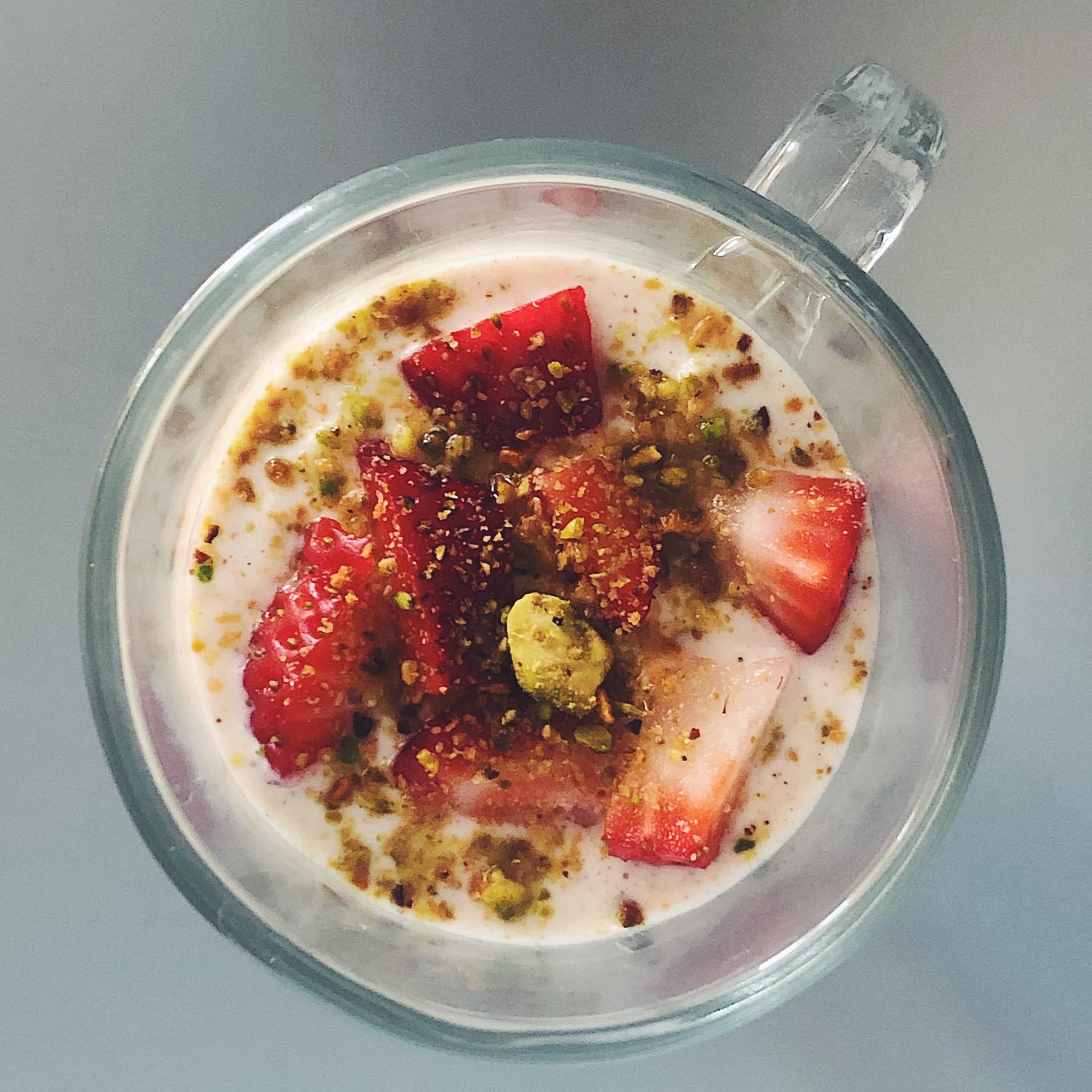 I’ve seen recipes using a variety of fruits but the most common are strawberries, mangoes and pomegranate seeds. For individual servings, put some fruit at both the bottom and the top of the glass.