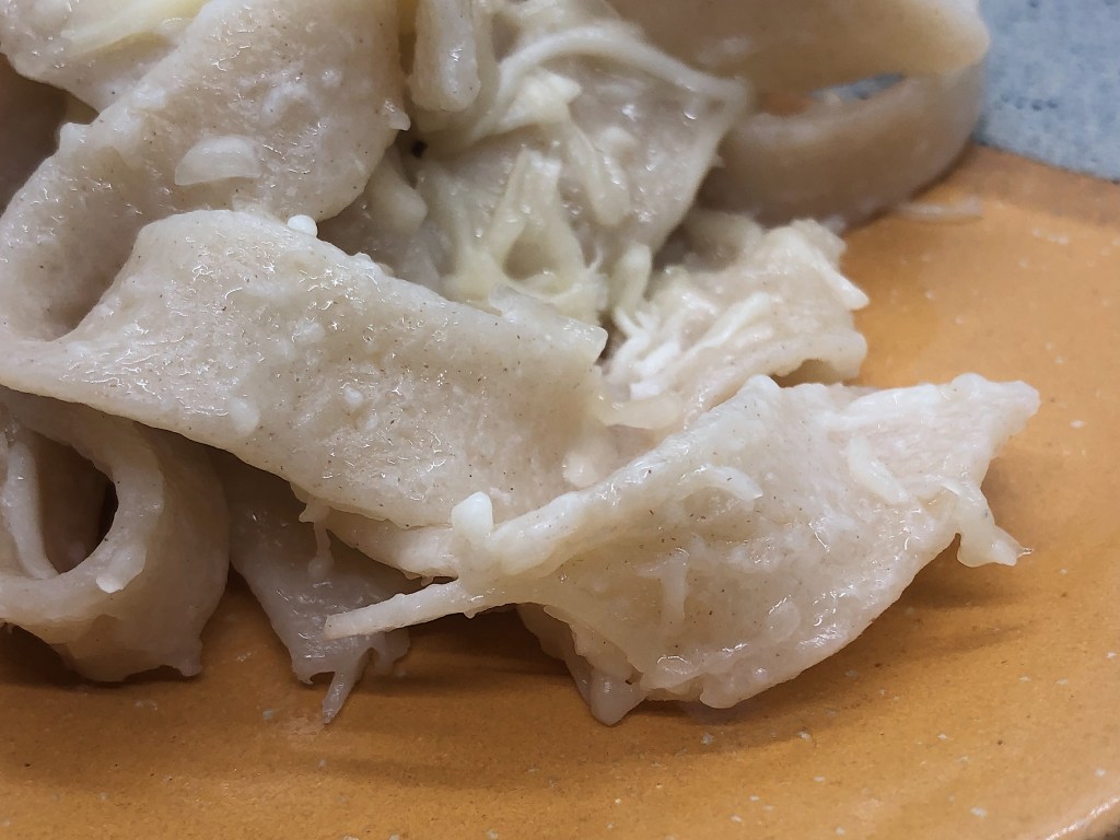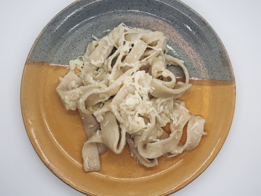 Macrows doesn’t give us any clues about what size or shape these pieces should be. You could do squares like the Italian lasanis, but I opted for something more straightforward like wide fettuccine. Shape your dough into a sort of rectangle and trim the edges if you want your pasta to be cut more evenly. Slice into strips. Another method is to roll up your dough rectangle then just slice it that way.