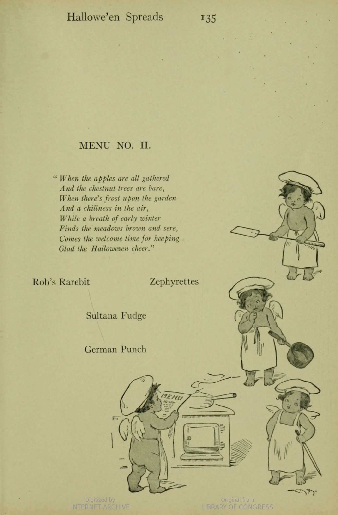 This book, like many party books, contains menus instead of actual recipes. Dame Curtsey offers some ideas for Halloween brownie parties, nut parties, fortunes, frolics, and even includes some photographs of some very…unique centerpieces.