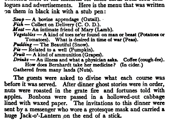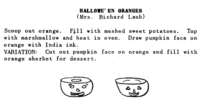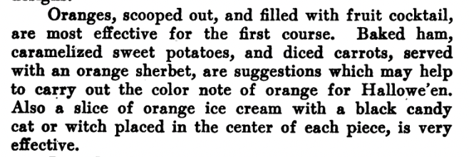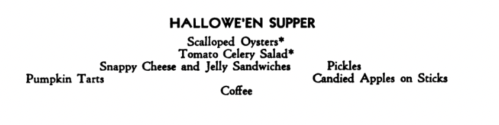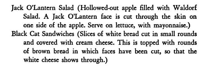 If you ever feel like doing some sleuthing on your own for more old-fashioned holiday party ideas, make sure you search for Hallowe’en (with an apostrophe), because most sources before the 1960s spelled it that way. BE WARNED, though, that books on entertaining and party-planning often contain ideas that are in shockingly bad taste. The older you go, the more likely it is that you’ll find something offensive.