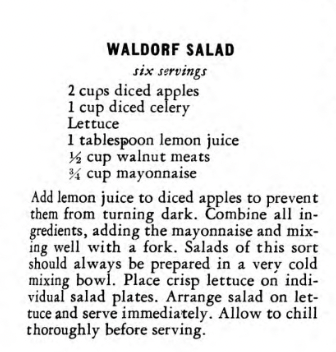 If you want to make the Jack O’Lantern Salad, use this 1940 recipe for Waldorf Salad from a book called Your Frigidaire recipes prepared by Home Economics Department, Frigidaire Division, General Motors Sales Corporation.