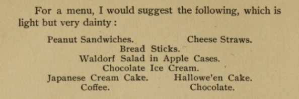 Menu description from The Art of Entertaining by Jean Walden (1927)