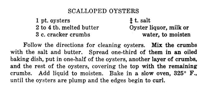 I did find a Scalloped Oyster recipe in another book called The Handbook of Recipes by Faith Lanman (1934):