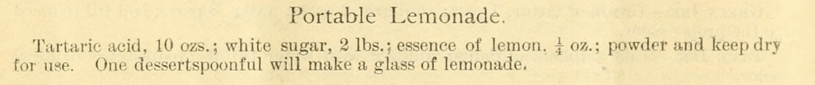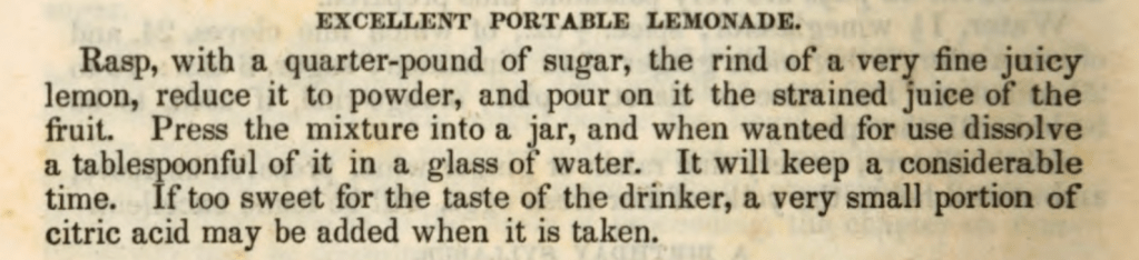I’ve gathered some additional sources and screenshots of recipes at the end of this post. For now, let’s get to my recreations of two common types of “portable lemonade.”