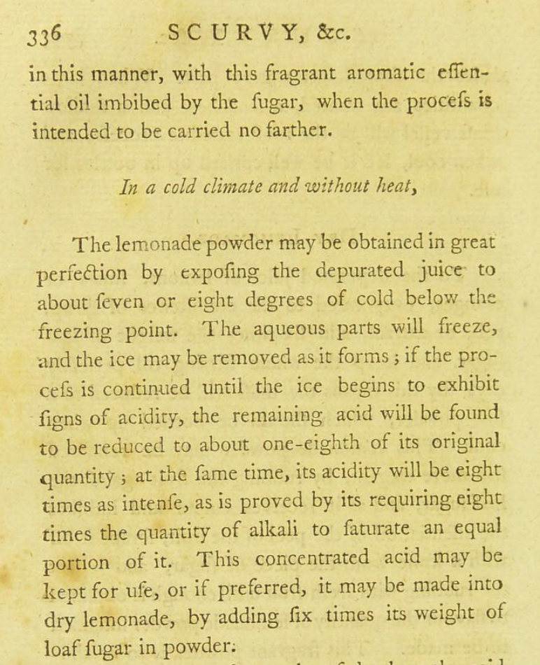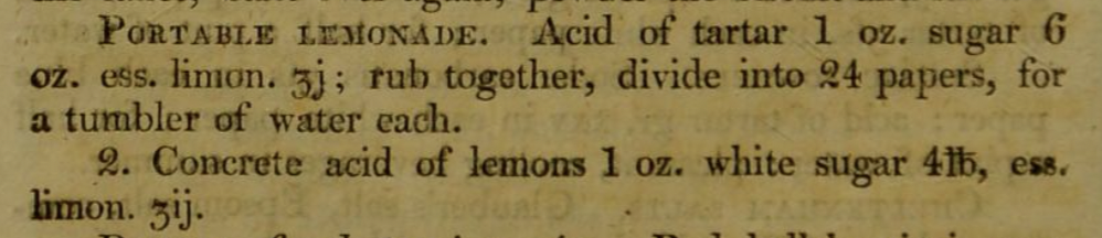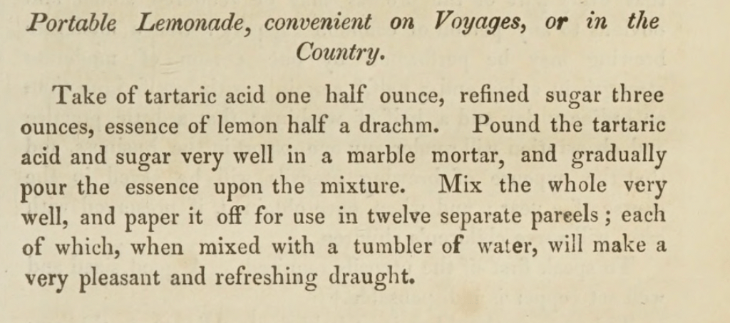 The oldest one I found, at least amongst the books available in my favorite digital repositories, is from 1794. This “dry lemonade” was recommended as a means to avoid getting scurvy on long voyages.