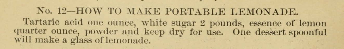 I’ve been on a lemonade kick lately so I decided to hunt for a new recipe in 19th century cookbooks. I am rarely shocked anymore by the things I find in these old books, but I’ll admit that the discovery of early instant lemonade powder mixes took me by surprise. I don’t know why it should – it makes perfect sense that travelers and picnickers would have wanted an easy portable drink option then just as they do now. Instant and imitation foods may seem like a modern concept, but there are a lot of products that have been around much longer that we realize.