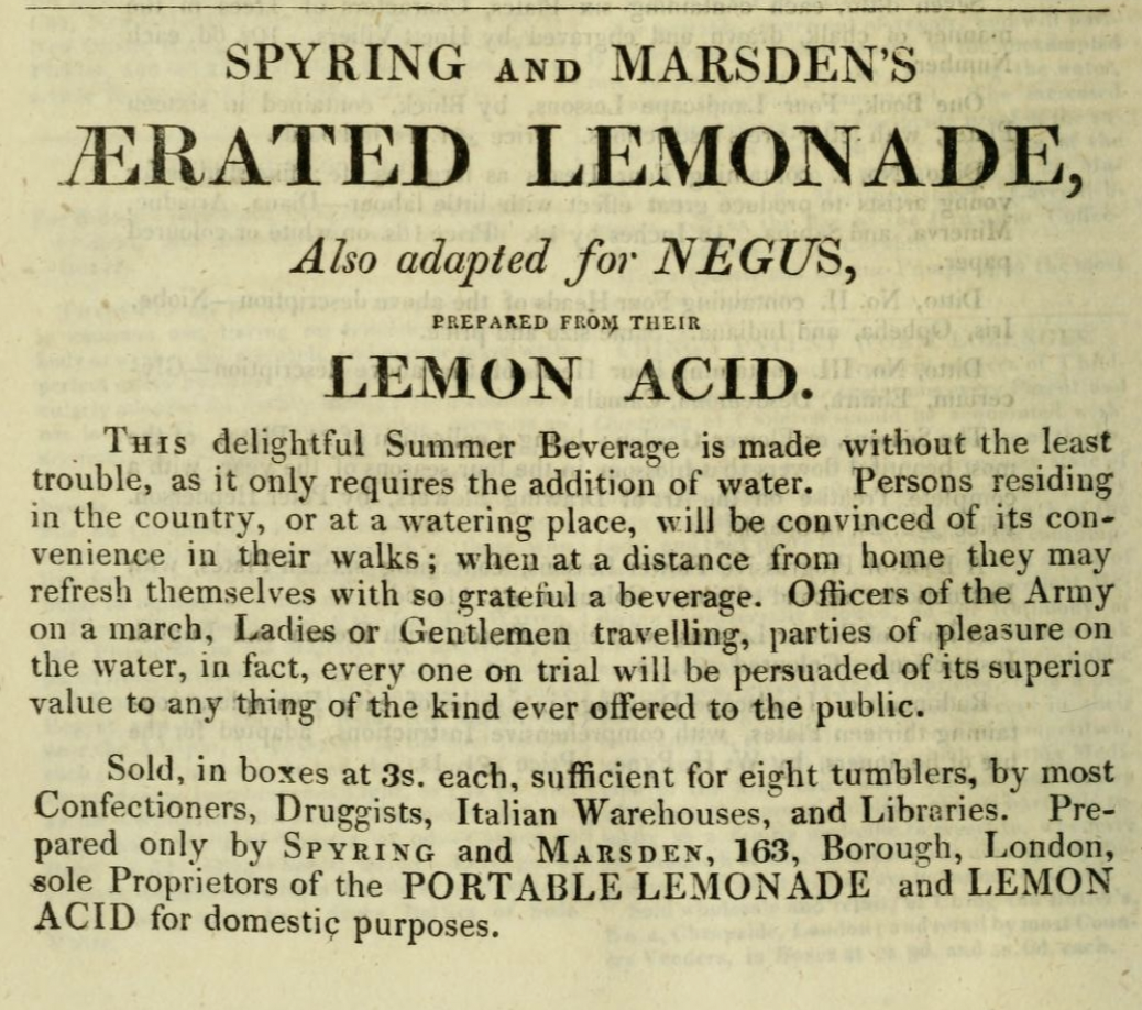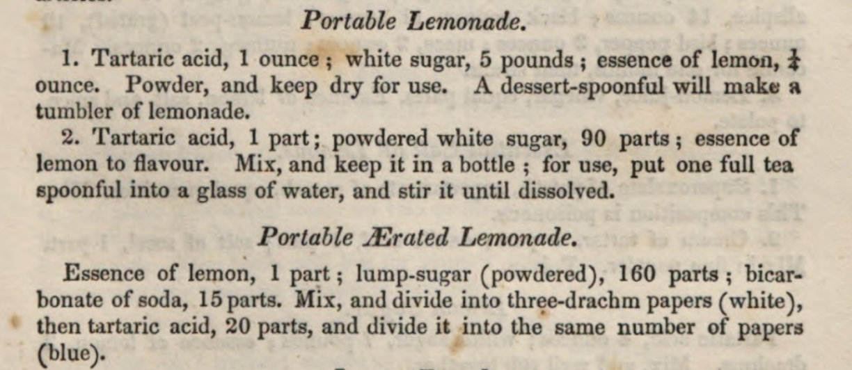 - A third version that I found mostly (but not exclusively) in medicinal or pharmaceutical books is something called “aerated lemonade,” which adds bicarbonate of soda to lemon essence, sugar, and citric/tartaric acid.