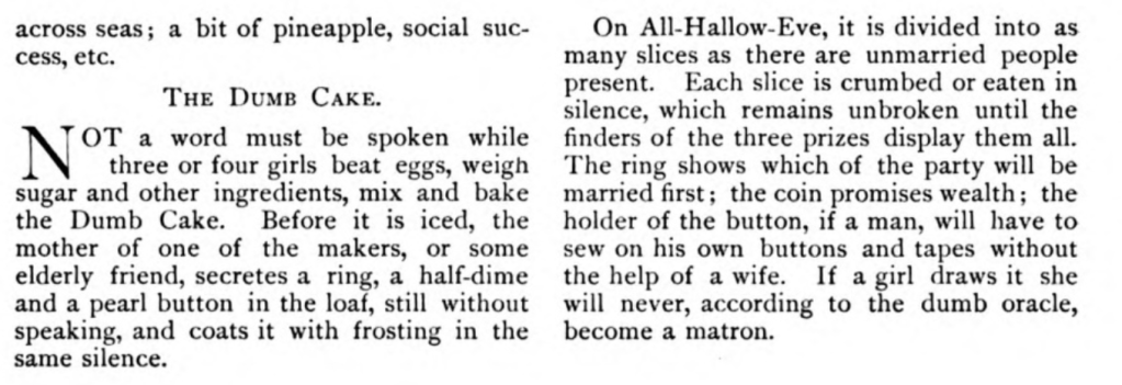 For decades, Halloween was the perfect time for young adults to conjure up a significant other at parties. I wrote a bit more about this in a past article about Hallowe’en Pumpkin Pie (1919). This was sometimes done through mirror gazing or apple bobbing, but often involved hiding objects like rings in food. Again, this kind of activity goes back centuries in Europe (medieval Kings Day feasts involved baking trinkets in cakes).